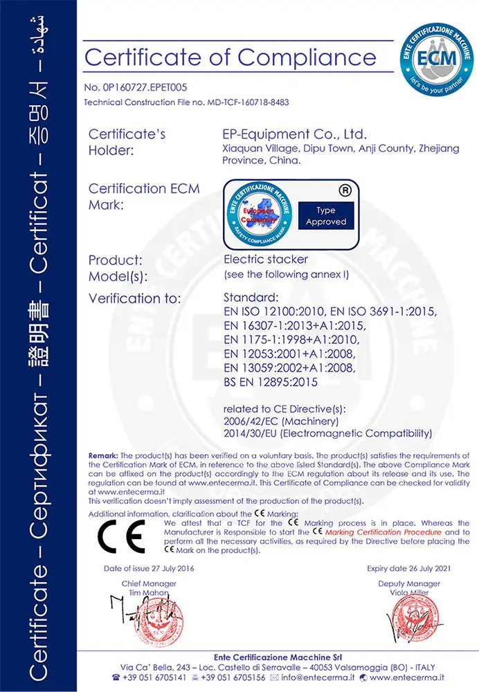 Сертификат EP-Equipment качество вилочных погрузчиков